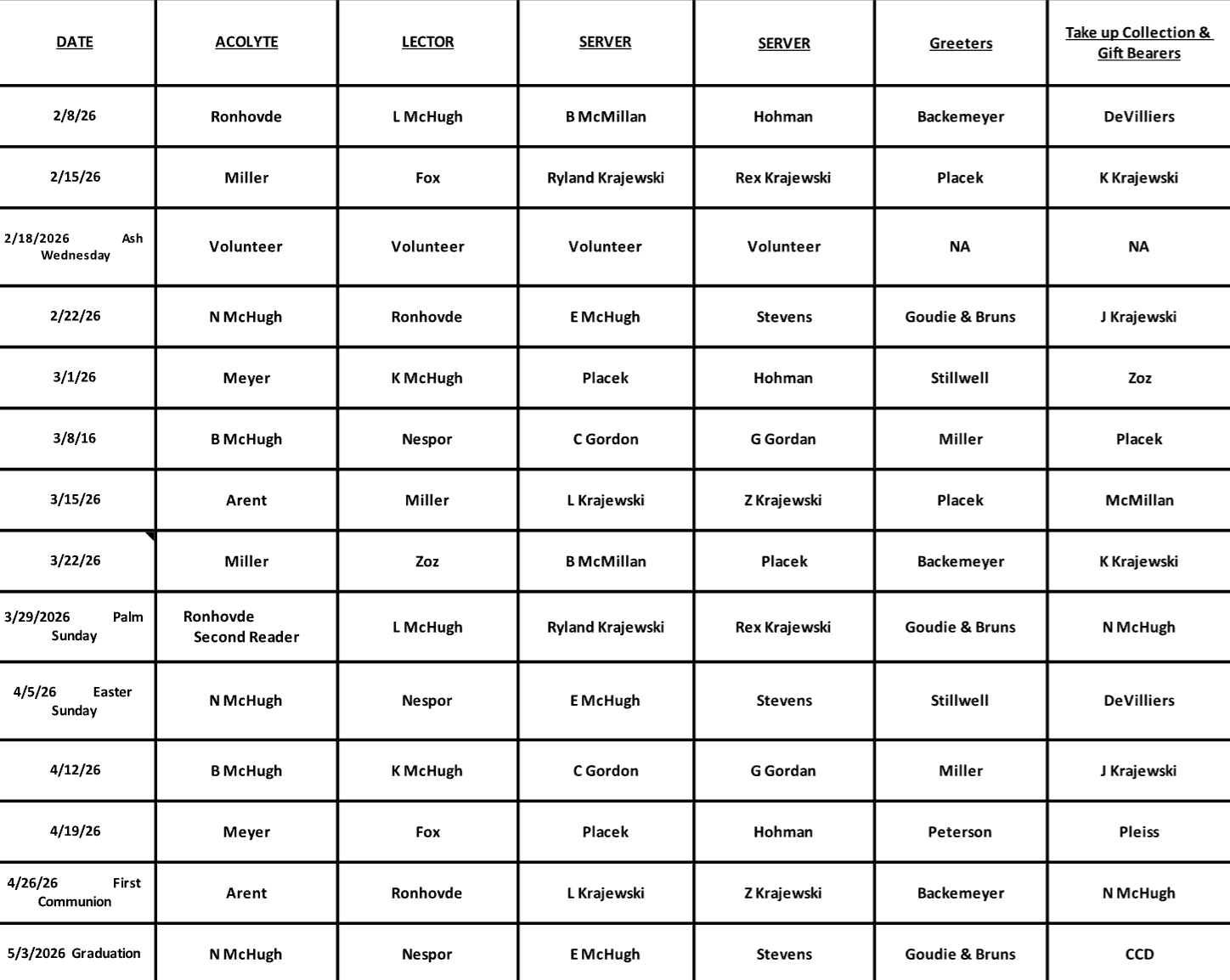 Click here to view the St. Mary’s minister schedule from 2/8/26-5/3/26.